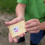 Auf dem Weg in den Wald sammelten 8 Erwachsene und 10 Kinder eifrig viele Steine, Gräser, Blüten und Blätter, um mit diesen Naturmaterialien großartige Kunstwerke zu kreieren. Es entstand schon bald ein schönes Mandala an einer Wegkreuzung mit Heu und Steinen. Im Wald angekommen fing es an zu regnen, das hielt uns aber nicht ab nochmals kreativ zu werden. Lange Äste und kurze Äste wurden gesammelt und zwischen 2 Bäume gespannt für eine Art großen Webrahmen oder um ein altes Glas gebunden, damit eine schöne Vase entstand. Mit den Blüten konnte die Vase verschönert werden oder die Blüten wurden in die Rinde einer Eiche gesteckt, so dass diese schön bunt aussah. Die Zeit verstrich und wir mussten schon wieder den Rückweg antreten. Dabei bekamen die Kinder zugeschnittene Klorollen mit doppelseitigem Klebeband um den Arm und darauf konnten sie dann Blüten, Gräser und dergleichen kleben. So entstanden schöne Armreifen.