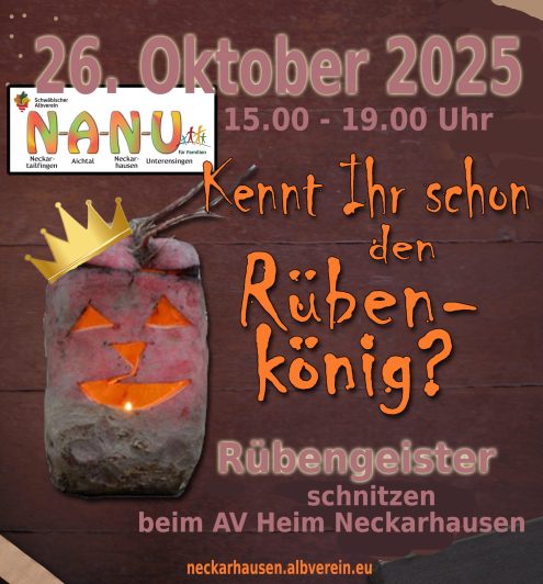 Wir wandern am Sonntag, den 09.11.2025 insgesamt 4-5 Kilometer und hören unterwegs dazu wilde Wald-Geschichten. Danach basteln wir (Kastanienmännchen & Windlichter) und genießen dazu eine leckere Suppe vom Feuer. Natürlich machen wir auch Stockbrot! Wir freuen uns auf Euch! Kerstin & Sina. Mitbringen: Grillgut, feste Wanderschuhe, ausreichend Trinken, 1 altes Marmeladenglas Termin : 09. November 2025, 10.30 Uhr Wanderparkplatz Albvereinsplatz (Grillstelle) Unterensingen, Bergstraße hochfahren Richtung Lindenweiler. Wer kann mit ? für Kinder ab 4/5 Jahren geeignet. Neue Familien sind immer herzlich willkommen ! Anmeldung gerne über Homepage www.sav-unterensingen.de oder per Telefon: 07022-2479317
