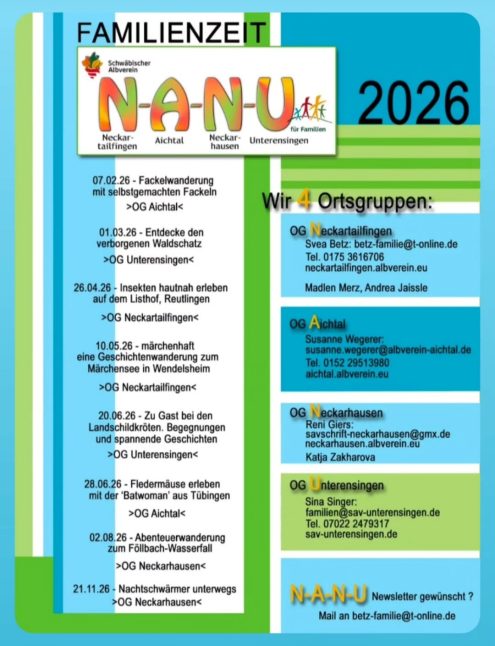 Die N-A-N-U Familienaktion wird vom Albverein Neckarhausen durchgeführt. Treffpunkt ist um 10.00 Uhr beim Albvereinsheim, Böllatstraße 56 in Neckarhausen.