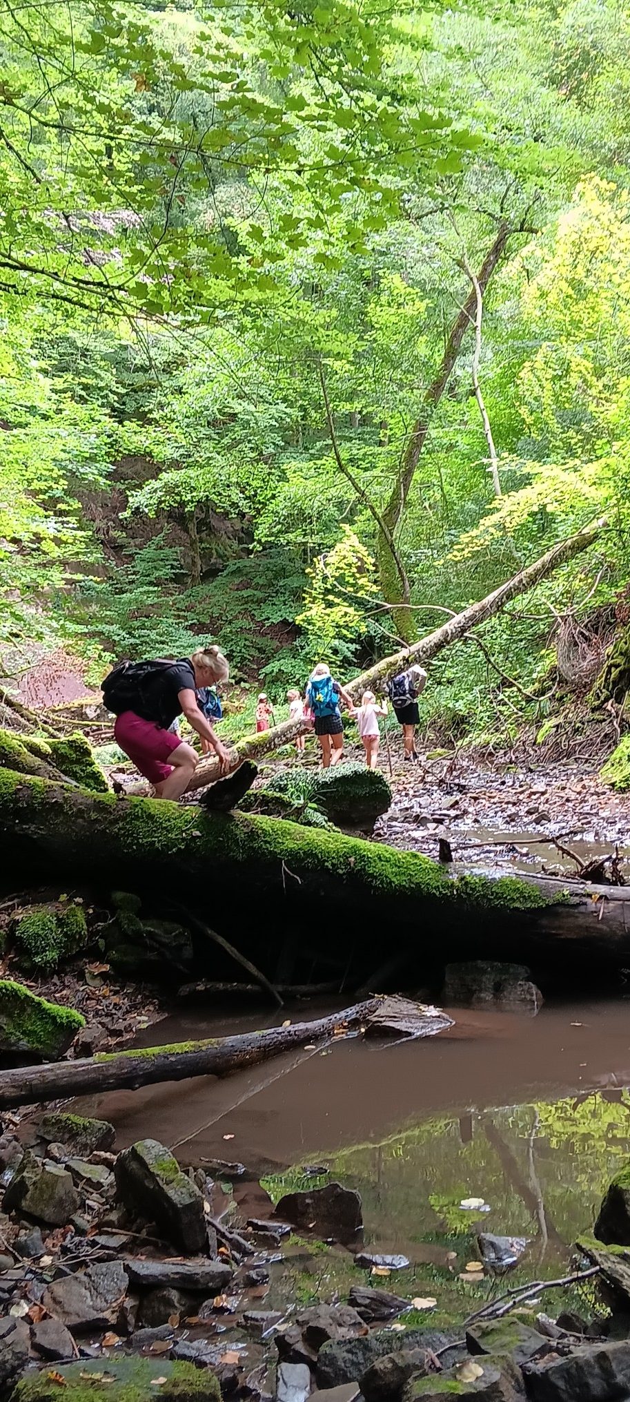 Am Sonntag, den 31. August 2025, hieß es: Wasserschuhe an – und rein ins Abenteuer! Einige Familien folgten dem Ruf des N-A-N-U und trafen sich am Wanderparkplatz beim Kloster Bebenhausen, um den Goldersbach einmal ganz anders zu erleben: beim Riverwalking. Nach einem kurzen Fußmarsch konnten es die Kinder kaum erwarten. Am Wasser angekommen war es erstmal bibber-kalt – aber nach den ersten Schritten war das Frösteln schnell vergessen. Ob vorsichtig über Stock und Stein oder gleich mittendrin durchs kühle Nass – alle hatten ihren Spaß, gemeinsam stapften wir bachaufwärts und schon bald reichte das Wasser etwas höher. So blieb es nicht aus, dass so mancher am Ende pitschnass war. Nach etwa einer halben Stunde legten wir am Bücherbaum eine wohlverdiente Pause ein. Beim Spiel „Wer bin ich?“ hatten vor allem die Kinder einen Riesenspaß. Überraschung: Niemand kannte das Indische Springkraut – und ausgerechnet an diesem Tag ließ es sich auch nicht blicken. Frisch gestärkt ging es weiter. Unterwegs entdeckten wir einen Frosch und so manches andere kleine Naturwunder. Zweieinhalb Stunden später kamen wir am Grillplatz „Geschlossener Brunnen“ an – und wurden schon von einem prasselnden Feuer empfangen – vielen Dank an Micha B. fürs Vorbereiten! Selbst unsere vierbeinige Begleiterin ließ es sich nicht nehmen, ein paar Wurstreste zu ergattern – liebevoll zugesteckt von den Kindern. Während die Erwachsenen entspannt plauderten, tobten die Kinder fröhlich durcheinander – harmonisch und voller Energie. So geht Sommer: Wasser, Natur, Gemeinschaft – und jede Menge Spaß!