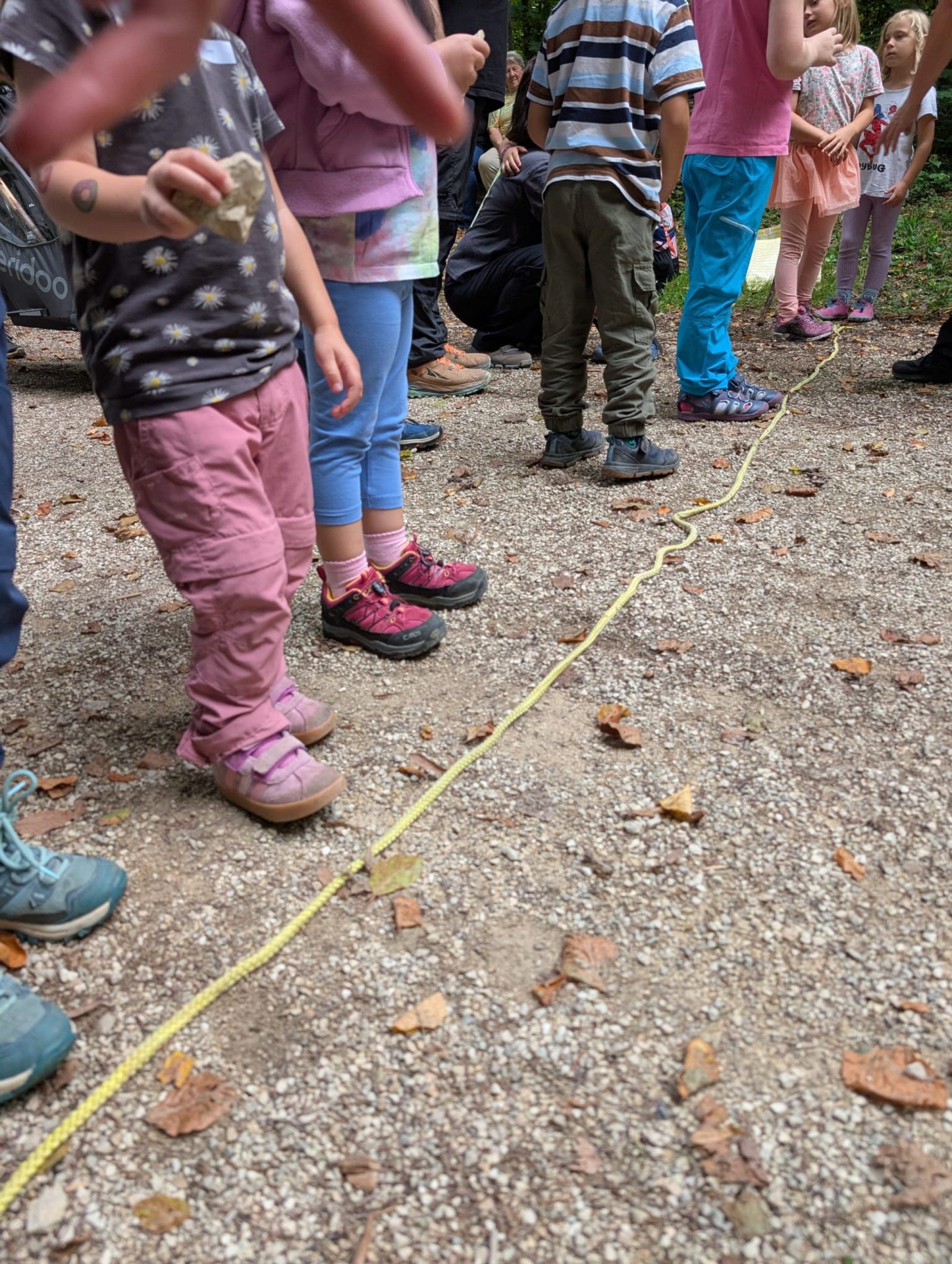 Unterwegs sammelten die Kinder Naturmaterialien wie Äste, Steine und Pflanzen, um daraus im Anschluss eigene steinzeitliche Beile zu basteln – mit großer Begeisterung und viel Kreativität. Als krönenden Abschluss erreichten wir die Burgruine „Hohen Wittlingen“, wo wir gemeinsam ein Picknick veranstalteten. Hier durften die Kinder außerdem ihre eigenen Naturfarben herstellen und sich an einer kleinen „Höhlenmalerei“ versuchen.