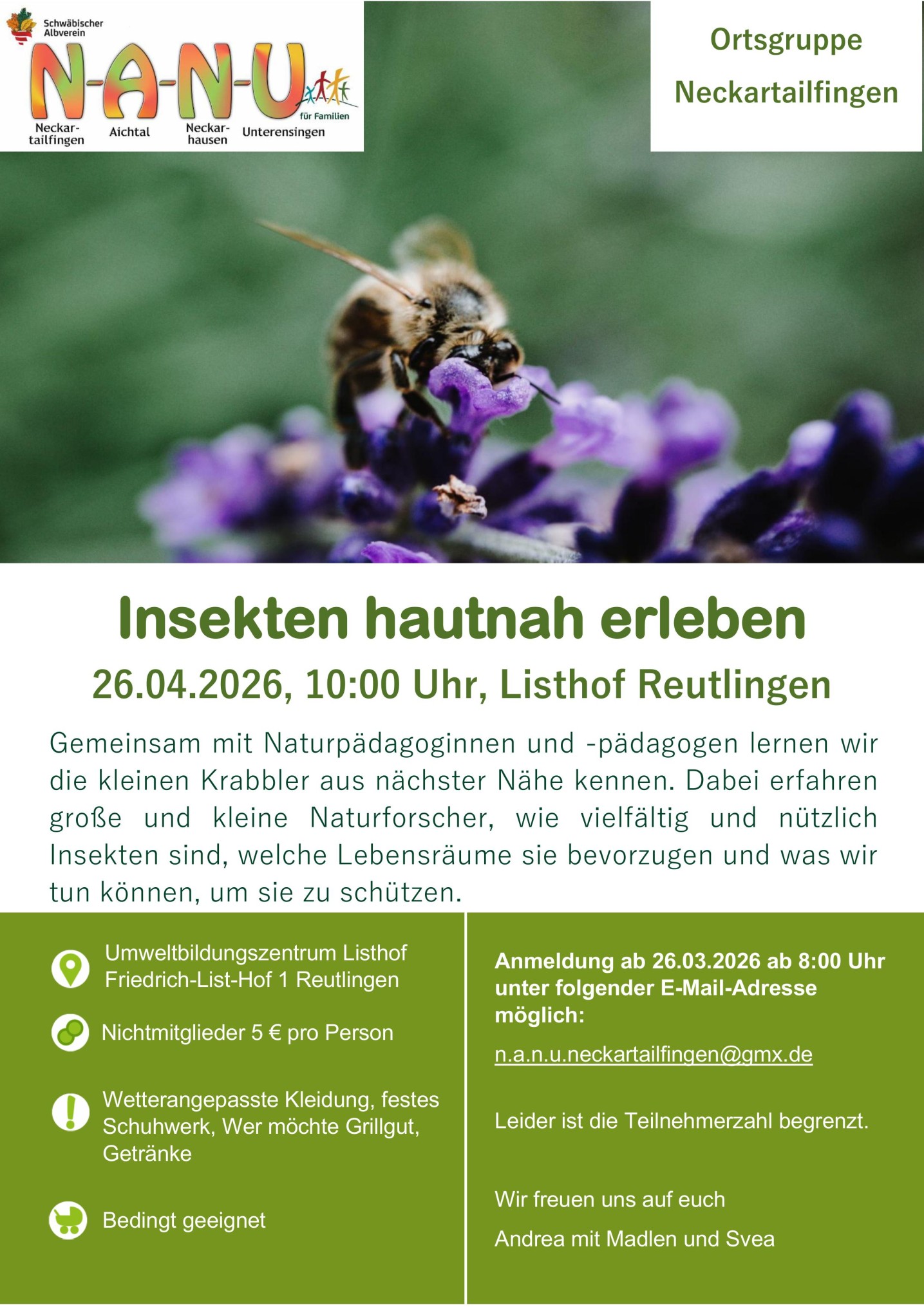 Am 26. April 2026 um 10:00 Uhr organisiert N-A-N-U Neckartailfingen einen Besuch auf dem Listhof Reutlingen. Wir laden zu einer faszinierenden Entdeckungsreise in die Welt der Insekten herzlich ein!