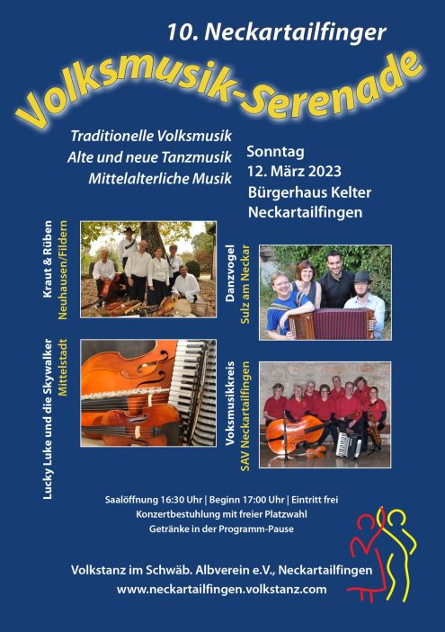 Wir laden recht herzlich zu unserer 10. Neckartailfinger Volksmusik-Serenade am 12. März 2023 im Bürgerhaus Kelter ein. Zusammen mit den befreundeten Gastgruppen „Kraut und Rüben“, „Danzvogel“ und „Lucky Luke und die Skywalker“ unterhält Sie der Volksmusikkreis mit traditioneller Volksmusik, alter und neuer Tanzmusik und mittelalterlicher Musik, gespielt auf den unterschiedlichsten Instrumenten. Durch das Programm führt Gerd Rieker. Beginn ist um 17.00 Uhr, Saalöffnung 16.30 Uhr. Erfrischungen in der Pause und nach dem Konzert. Der Eintritt ist frei, über eine Spende würden wir uns freuen.