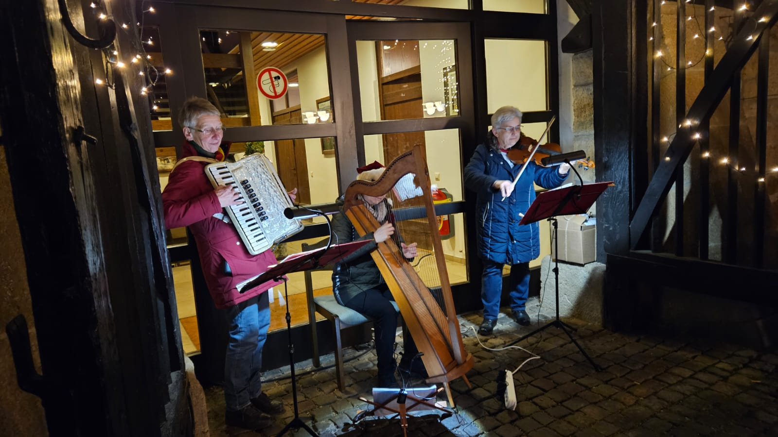 Ausgefallenen Hörgenuss garantierte einmal mehr die Gruppe „Kraut & Rüben“ aus Neuhausen/Filder. Mit zum Teil vom Leiter der Gruppe, Klaus Gauler, nach alten Originalen selbst nachgebauten Musikinstrumenten wurden die Besucher zu einer Reise quer durch Europa mitgenommen. Und so konnte man in unserer Kelter ausgesprochen wirkungsvoll unter anderem Instrumente wie Cornamusen, Krummhörner, Spinett, Kantele, schwäbische Sackpfeife und die schwedische Nyckelharpa hören.